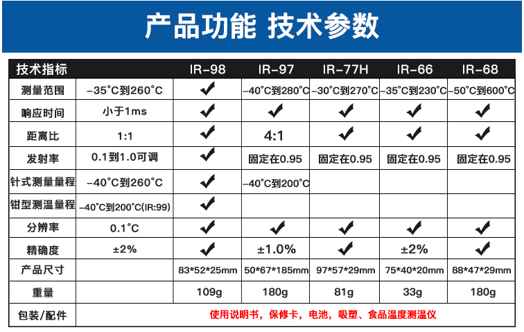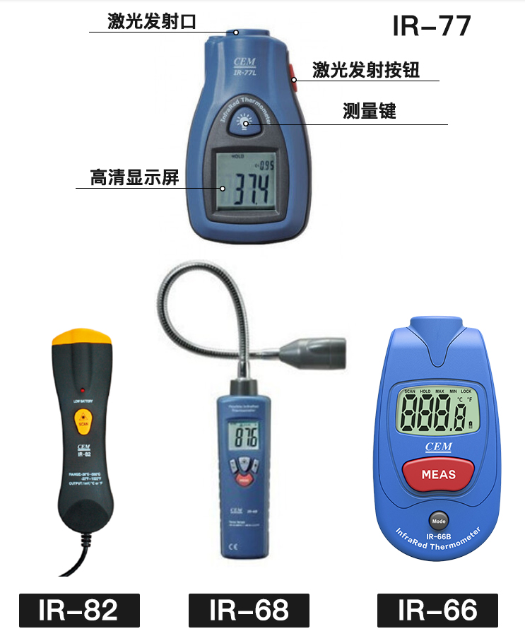 IR-66掌上式紅外測溫儀包括IR-66、IR-66B兩個型號。 CEM出品的IR-66系列掌上式紅外線測溫儀,符合人體工程學設(shè)計,其體積比手掌還小,方便攜帶,是您工作上各種設(shè)備檢修、溫度情況了解,以及您日常生活起居的多功能測溫儀佳選擇。 IR-66掌上式紅外線測溫儀特性: 1.*的非接觸式測量 2.獨特新穎的外觀設(shè)計 3.自動關(guān)機及自動記錄數(shù)據(jù) 4.℃/℉ 轉(zhuǎn)換裝置 5.自動量程選擇及大小值記錄 6.小巧的尺寸設(shè)計使測量方便又便于攜帶 7.大的液晶顯示屏 8.上鎖功能及低電量提示