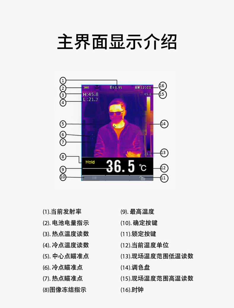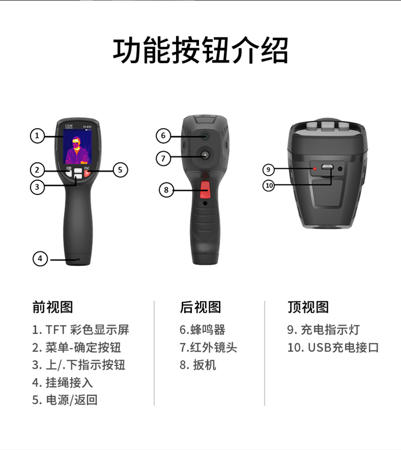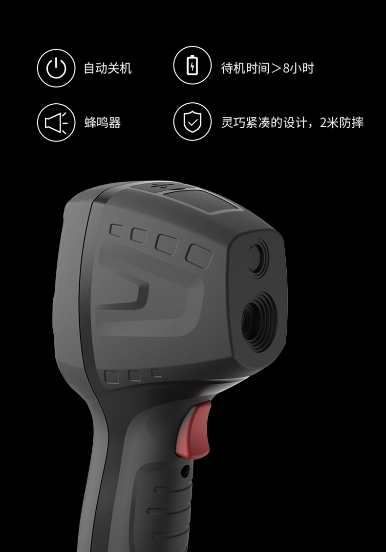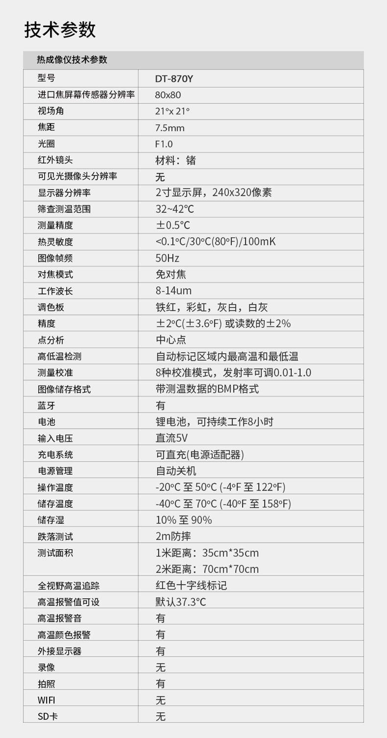 分辨率:80*80、圖像幀頻:50HZ、篩查測溫范圍:32-42℃、藍牙連接手機軟件