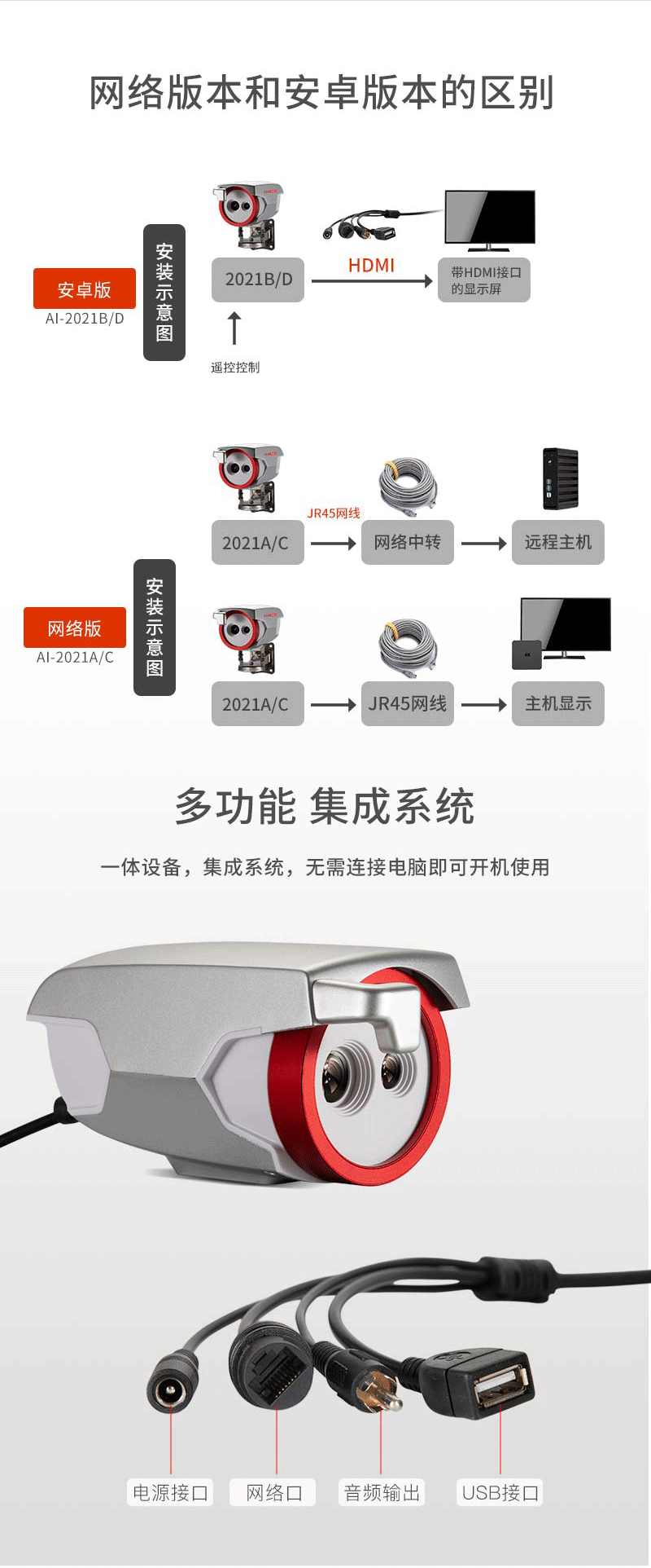 2安裝與維護 2-1,紅外熱像告警系統(tǒng)部署原則 AI-2021紅外熱像告警系統(tǒng)屬于精密測溫和成像設(shè)備,對部署應(yīng)用有一定要求,注意事項如下: ·安裝環(huán)境:設(shè)備機頭所處位置需光線良好(照明度≥10OLux),應(yīng)避免處于逆光的位置;設(shè)備機頭布置位置附近3米范圍內(nèi)不應(yīng)有空調(diào)出風(fēng)口;設(shè)備機頭所監(jiān)控的視場內(nèi),不能受到光照、西曬等外界強熱源的干擾; ·機頭布置:合理布置AI-2021機頭的位置,向下俯視角度為13°~15°;合理布局人員檢測位置和范圍,Al-2021機頭的攝像頭距離被測人員的額頭的位置為1.0~5.0米,最佳測試位置為2.0米; ·被測人員要求:戶外陽光照射后,或者劇烈運動后,需在室內(nèi)環(huán)境平靜適應(yīng)5分鐘后進行測試;人員從戶外場景進入室內(nèi),建議經(jīng)過回廊緩沖至少10秒鐘后,再步入檢測位置,如果室內(nèi)外溫差較大時,建議在室內(nèi)停留2~3min再行檢測;確保待測人員整個面部處于設(shè)備攝像視野內(nèi),同時面部及額頭不能被遮擋(帽子、圍巾、墨鏡、面具、退燒貼等可能遮擋面部的物件,建議先提前摘下,適應(yīng)0.5-1分鐘后再進行測試。)