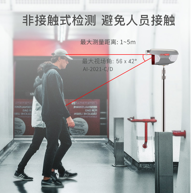 2安裝與維護(hù) 2-1,紅外熱像告警系統(tǒng)部署原則 Al-2021紅外熱像告警系統(tǒng)屬于精密測溫和成像設(shè)備,對部署應(yīng)用有一定要求,注意事項如下: ·安裝環(huán)境:設(shè)備機(jī)頭所處位置需光線良好(照明度≥10OLux),應(yīng)避免處于逆光的位置;設(shè)備機(jī)頭布置位置附近3米范圍內(nèi)不應(yīng)有空調(diào)出風(fēng)口;設(shè)備機(jī)頭所監(jiān)控的視場內(nèi),不能受到光照、西曬等外界強(qiáng)熱源的干擾; ·機(jī)頭布置:合理布置A-2021機(jī)頭的位置,向下俯視角度為13°~15°;合理布局人員檢測位置和范圍,AI-2021機(jī)頭的攝像頭距離被測人員的額頭的位置為1.0~5.0米,最佳測試位置為2.0米;