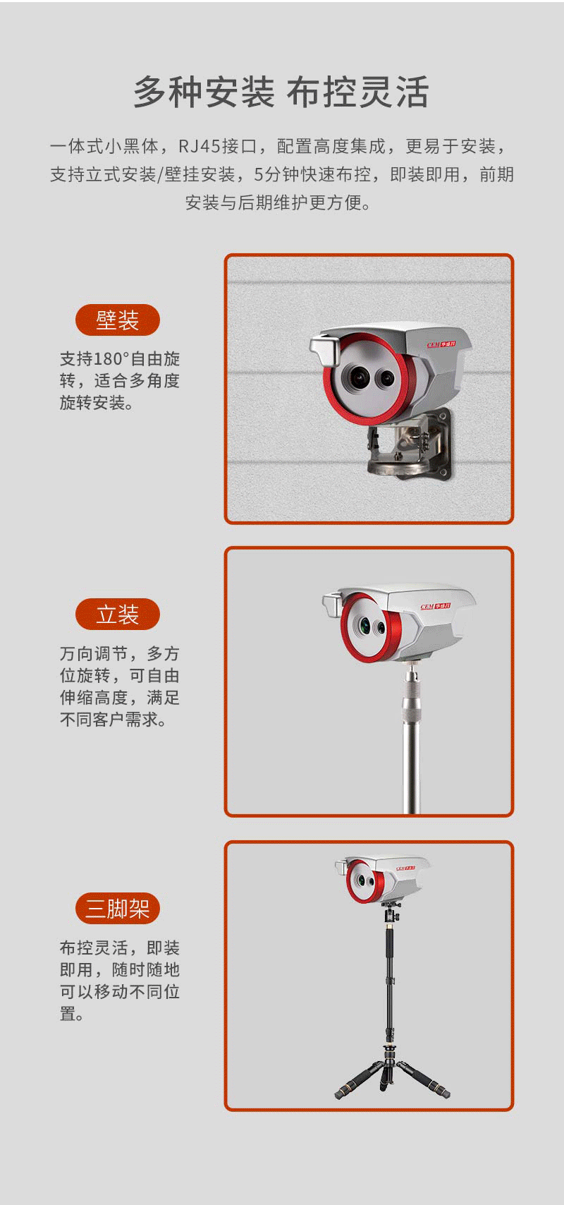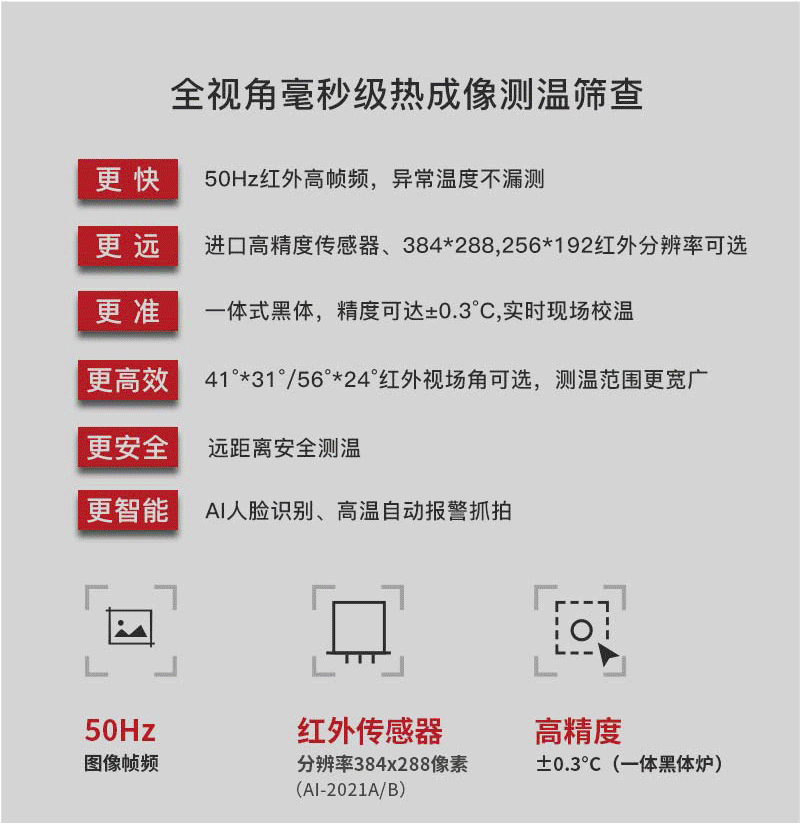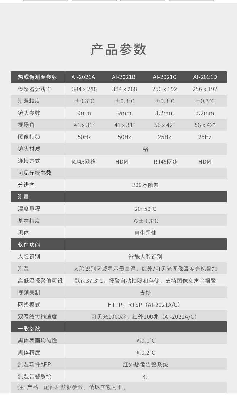 注意事項 紅外熱像告警系統(tǒng)應(yīng)正確安裝,可自動跟蹤人體額頭區(qū)域并顯示體溫,操作人員應(yīng)經(jīng)生產(chǎn)廠家專業(yè)培訓(xùn),并嚴(yán)格按說明書使用。 ·應(yīng)嚴(yán)格按照中國國標(biāo)(GB_T19146-2010)和各地市場監(jiān)管局的要求創(chuàng)造使用條件;﹒嚴(yán)格按照規(guī)范要求,安裝在室內(nèi)無風(fēng)或者微風(fēng)的固定位置使用,室溫環(huán)境在16°℃~32℃,避免陽光、風(fēng)和其他熱源干擾(環(huán)境溫度超出16°℃~32°℃,需要安裝空調(diào),并在產(chǎn)品3m內(nèi)無風(fēng)或者微風(fēng)); ·若安裝在室外,必須搭建棚子或者板房來保證環(huán)境穩(wěn)定; ·戶外陽光照射后、劇烈運(yùn)動后或從溫差較大的戶外場景進(jìn)入室內(nèi),需在室內(nèi)環(huán)境平靜靜置5分鐘后進(jìn)行測試。