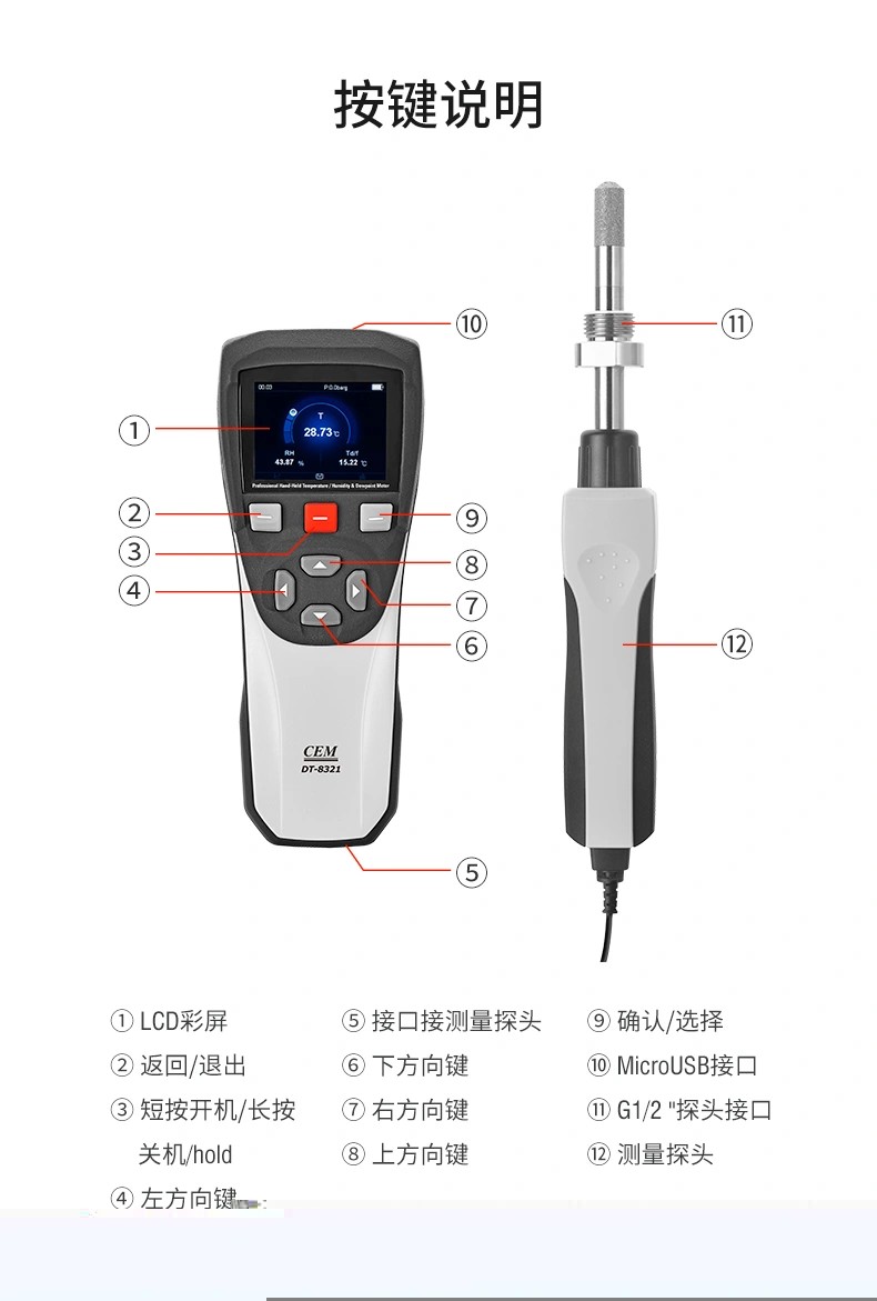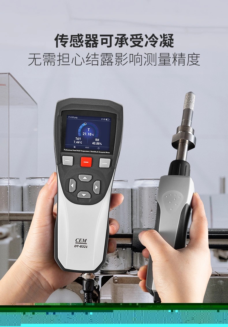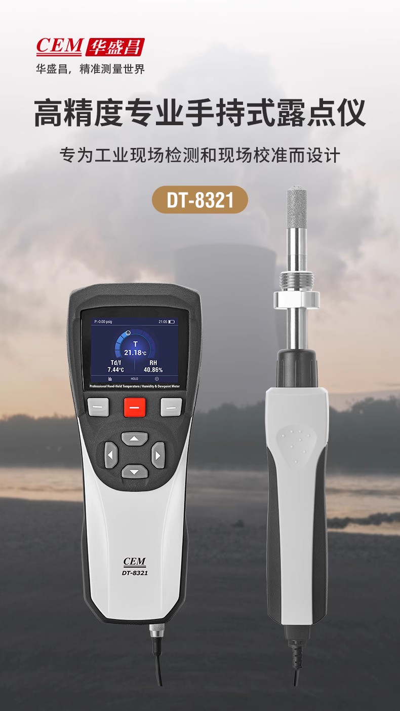 產(chǎn)品概述 CEM DT-8321是CEM華盛昌新設(shè)計、研發(fā)和制造的一款高精度專業(yè)手持式露點儀,精度高范圍廣,能在較寬的測量范圍內(nèi)準(zhǔn)確測量露點溫度,探頭可直接插入加壓過程中,并快速響應(yīng)測試過程環(huán)境條件,為工業(yè)露點測量應(yīng)用提供準(zhǔn)確快速的測量。產(chǎn)品廣泛應(yīng)用于實驗室、電力電氣、SF6氣體測量、精密制造、化工制藥等領(lǐng)域的大溫度、大壓力范圍內(nèi)的直接過程露點測量。 產(chǎn)品優(yōu)勢 性能穩(wěn)定,維修成本低,可專業(yè)用于工業(yè)現(xiàn)場檢測和戶外校驗等場合。 高品質(zhì)傳感器,測量更準(zhǔn)確,適用于低露點測量。測量范圍達(dá)-50至+30°C,低濕度測量<5%RH。●傳感器可承受凝結(jié),無需擔(dān)心結(jié)露影響測量精度。 傳感器探頭具備凈化功能以及加熱功能,預(yù)熱時間短,測量結(jié)果更穩(wěn)定。 靈活的數(shù)據(jù)記錄功能,可設(shè)置自動記錄間隔,CSV文件可以通過USB傳輸?shù)絇C端。 測量數(shù)據(jù)可一鍵保存,可使用電腦中的Excel軟件查看。 外形堅固,緊湊,小巧,外加藍(lán)色彩屏設(shè)計,界面更加直觀簡潔。 可充電設(shè)計,持久續(xù)航更方便。
