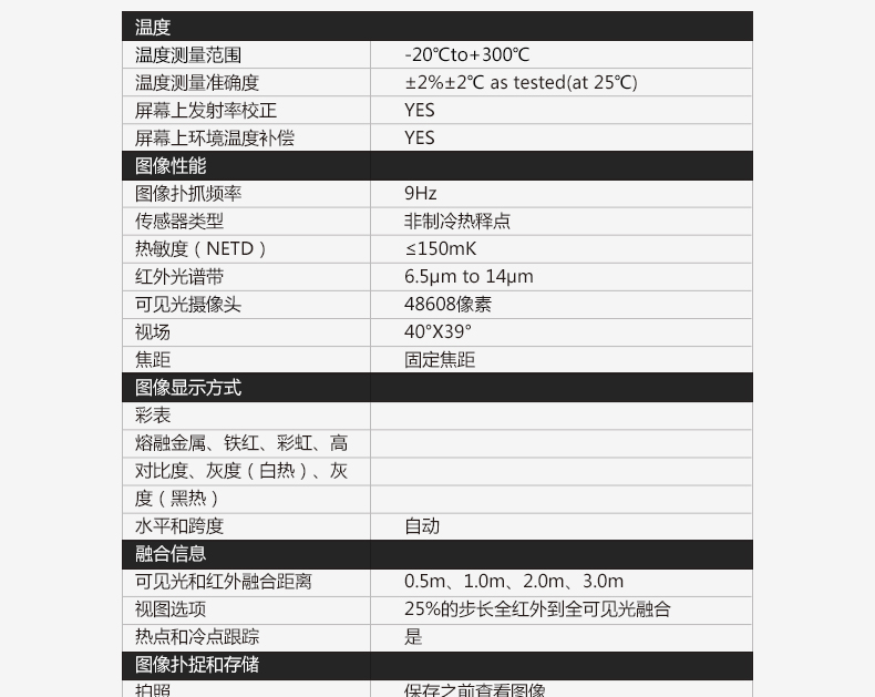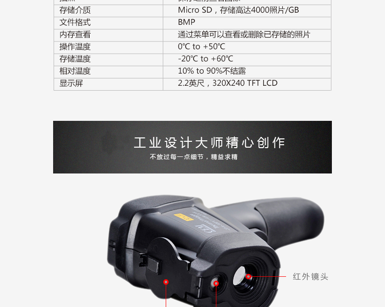 2.2寸TFT 320*240像素彩色液晶顯示屏;分辨率32*31像素;圖片捕獲頻率9Hz;熱靈敏度;自動追蹤標(biāo)識區(qū)域內(nèi)最高溫和最低溫;拍照功能;支持MicroSD儲存卡和數(shù)據(jù)記錄功能;時間/日期/設(shè)置,可調(diào)輻射率和鎖屏;可充電鋰電池;支持USB接口;語言種類:英語;Meterbox IRTP 和云儲存