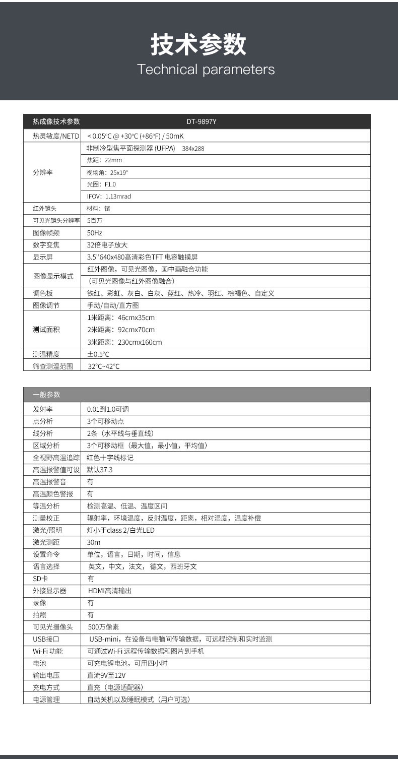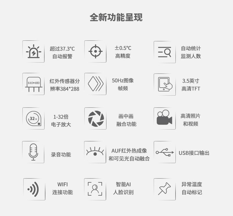 分辨率:384*288、圖像幀頻:50HZ、篩查測溫范圍:32-42℃、HDMI輸出大屏全屏顯示、AI人臉識別、自動統(tǒng)計(jì)監(jiān)測人數(shù)、可同時完成多人測溫。