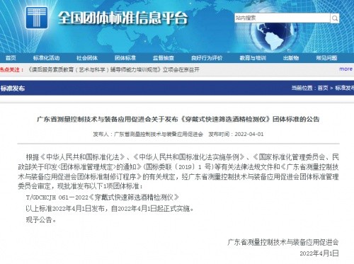近日,由我們總公司深圳市華盛昌科技實(shí)業(yè)股份有限公司牽頭起草的《穿戴式快速篩選酒精檢測(cè)儀》團(tuán)體標(biāo)準(zhǔn)審定會(huì)已經(jīng)過(guò)廣東省測(cè)量控制技術(shù)與裝備應(yīng)用促進(jìn)會(huì)的審查,《穿戴式快速篩選酒精檢測(cè)儀》團(tuán)體標(biāo)準(zhǔn)于2022年4月1日在全國(guó)團(tuán)體標(biāo)準(zhǔn)信息平臺(tái)正式發(fā)布并實(shí)施。