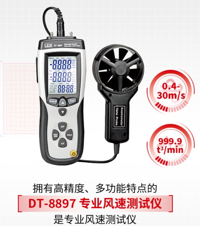 能夠支持多種單位自由換算輕松測量風速、風量和風溫測量風速范圍達0.4-30m/s流量數(shù)據(jù)可達999.9t3/min內(nèi)置usb接口,在風速測試時能夠實現(xiàn)實時分析,快速傳輸