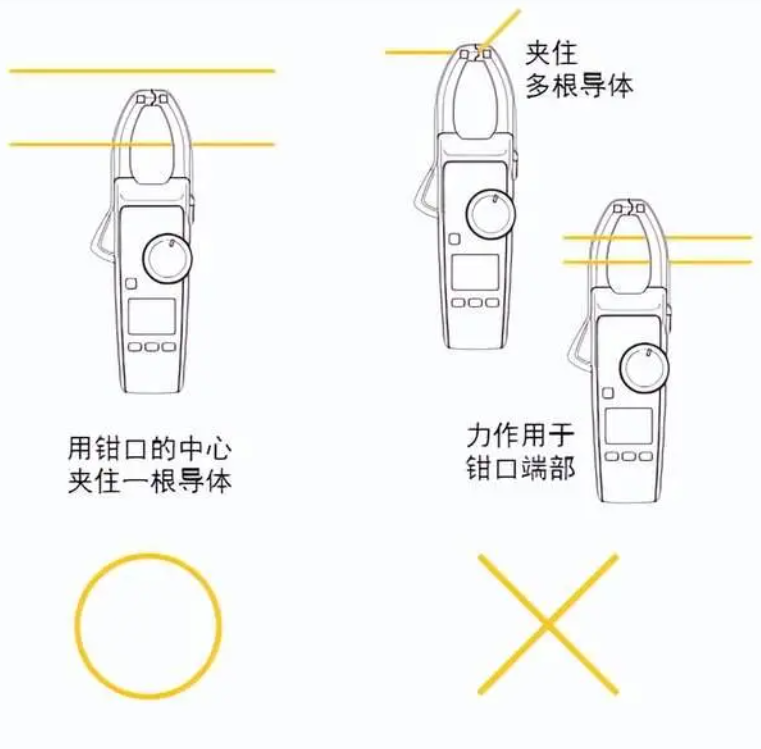 在測(cè)量時(shí),要使被測(cè)量的導(dǎo)線位于鉗口的中央處,并且使鉗口處于閉合緊密狀態(tài),這樣可以有效地減少誤差。