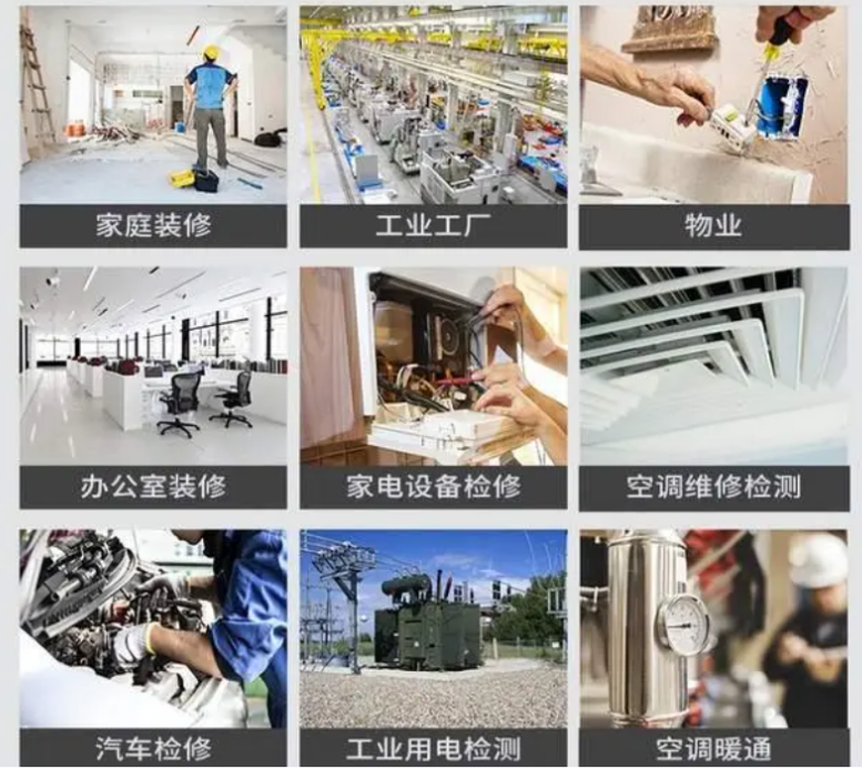 用于家庭或辦公室裝修、物業(yè)維修、家電設(shè)備檢修、汽車檢修、工業(yè)用電檢測(cè)等場(chǎng)景。