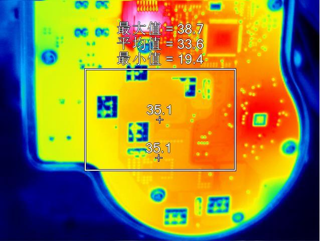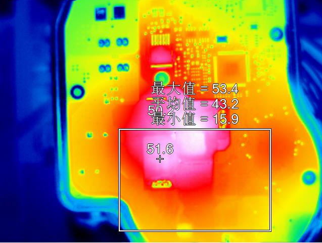 使用紅外熱像技術(shù)對PCB電路板進(jìn)行發(fā)熱測試。下圖為PCB電路板的發(fā)熱情況測試,需要觀測PCB電路板表面的溫度分布情況,來確認(rèn)是否處于工作溫度內(nèi)。