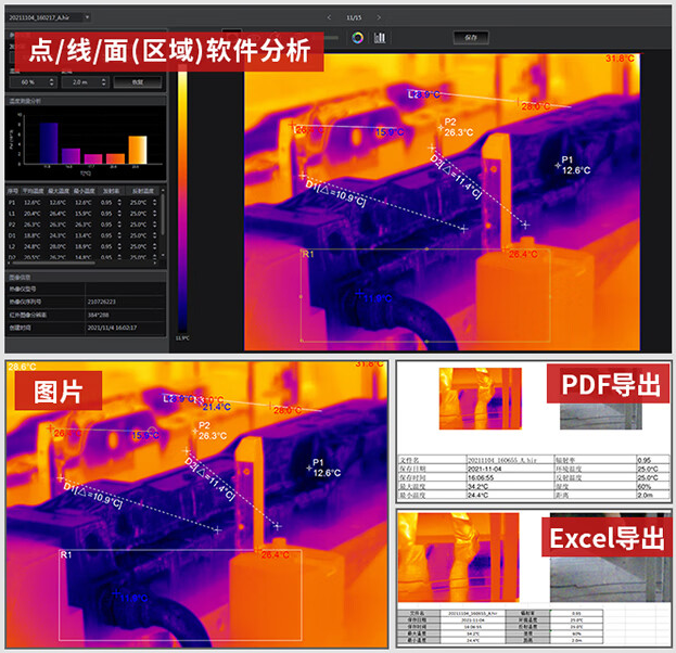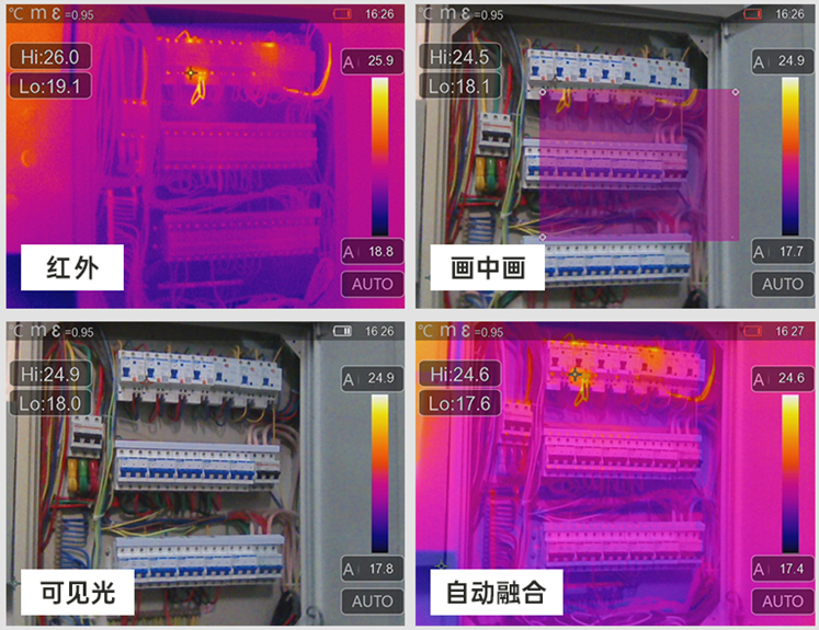 紅外圖像和可見光圖像的組合顯示,能更精準(zhǔn)地識別溫差,讓工程師可以更好觀察接觸點(diǎn)長期處于高溫狀態(tài)的情況,減少工作量。因?yàn)楣こ處熆筛鶕?jù)可見光圖片來判斷紅外圖片中熱點(diǎn)的未知,并自動生成報(bào)告,減少操作時間,提高工作效率。